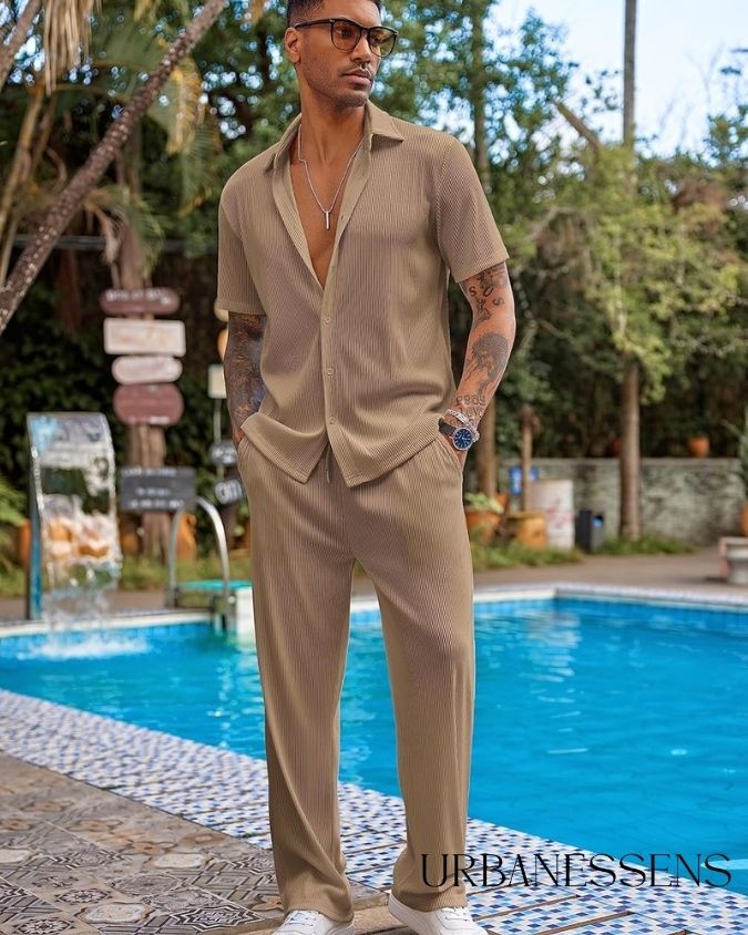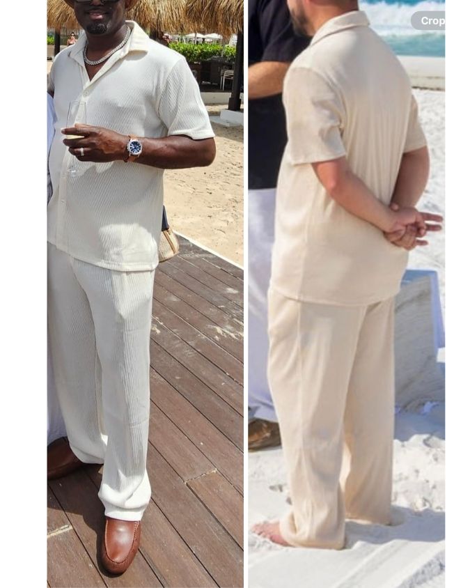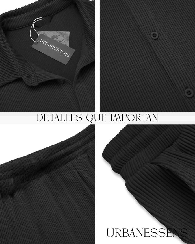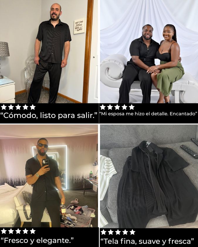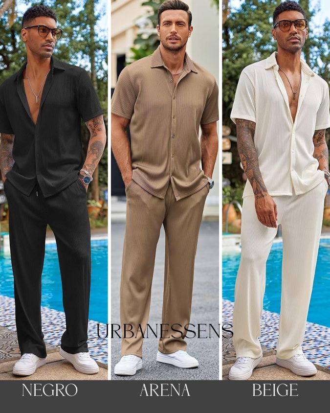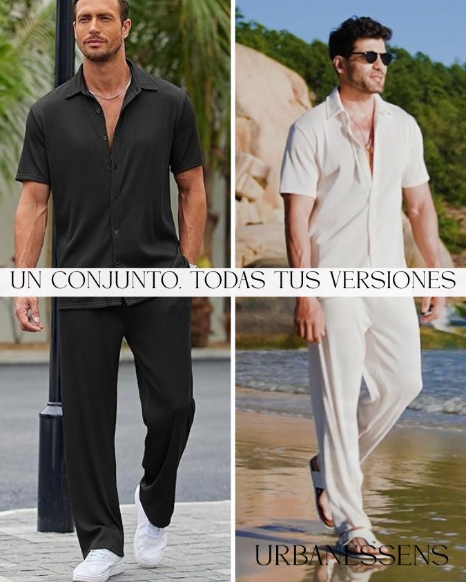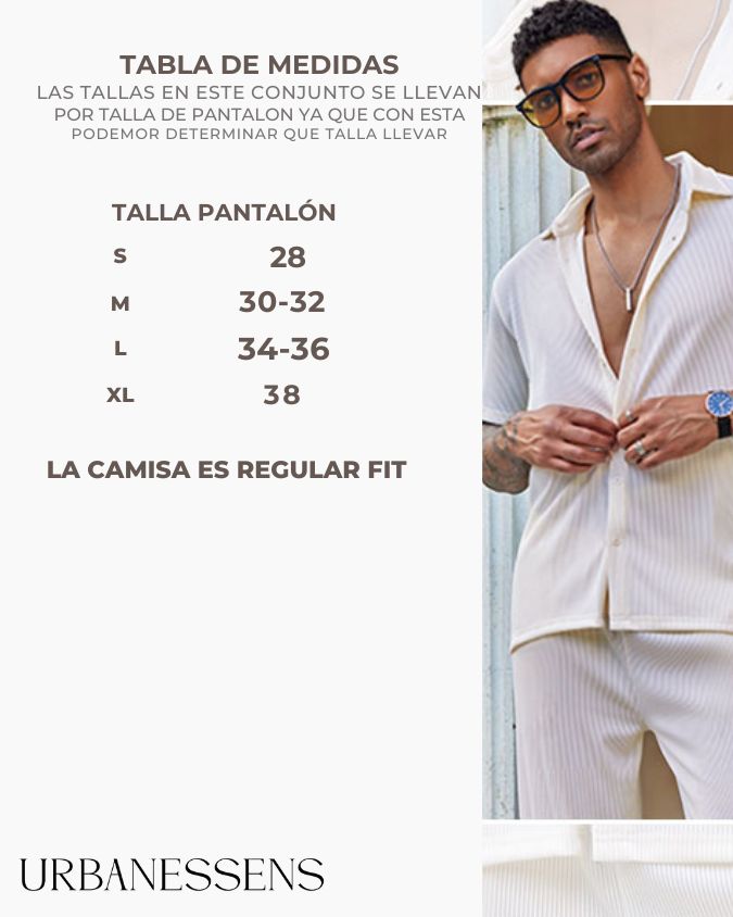 Es una horma suelta con caída limpia que no aprieta. La camisa resalta los hombros y el jogger cae recto, estilizando la figura. Si quieres un look más ajustado, pide una talla menos.